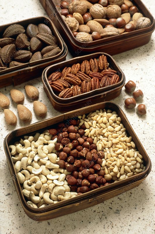Mixed nuts. Trays of assorted nuts. These are walnuts (top right tray, also contains hazelnuts and almonds), brazil nuts (upper left), pecans (upper centre), almonds (centre left), hazelnuts (centre right), and cashew nuts, hazelnuts and pine nuts from left to right in the bottom tray. Nuts are an excellent source of vitamin E and some of the B-complex vitamins, and also contain protein and a variety of essential minerals. Some people have a hypersensitivity to nuts which manifests as an extreme allergic reaction. Even a brush of nut across the skin can provoke the response.